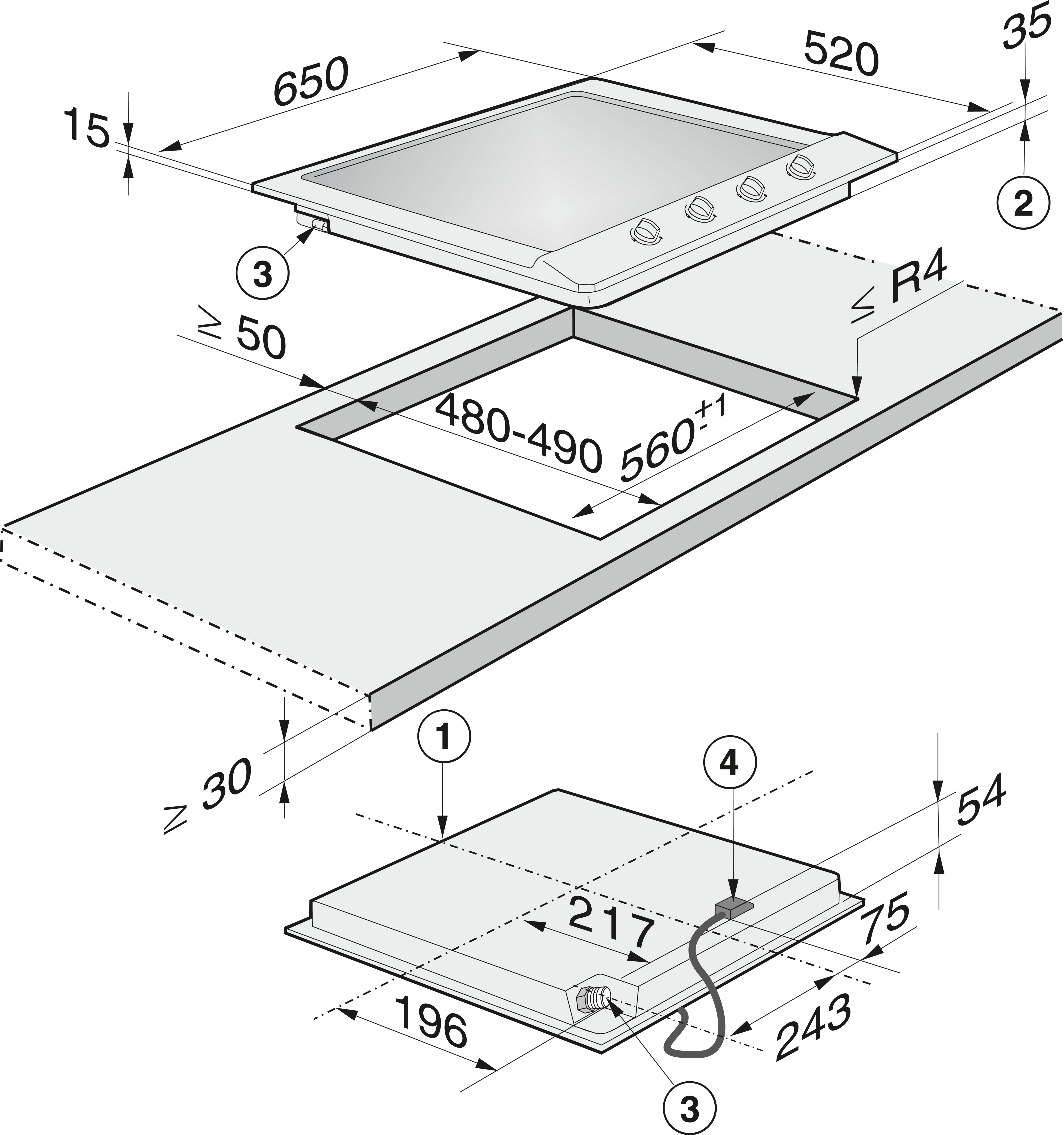Размеры выреза (Ш х Г), установка на поверхности, в мм